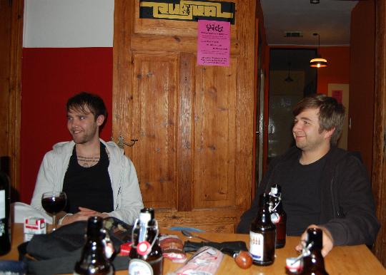 Gegen Mittag gibt sich Norman kurzzeitg als der Große Fuck Off aus und beschließt, sich wieder hinzulegen, zum Aufstehen ist es definitiv noch zu früh. Das passiert dann ein paar Stunden später. Brötchen, Rührei, Kaffee und Dusche – anschließend quer durchs Land nach Rendsburg. Leckerer Spätnachmittags-Brunch bei Normans Familie und dann auf zur „T-Stube“, wo das letzte Konzert auf der Tour stattfindet. Etwas alternativer als die anderen Locations, Norman ist gespannt wie es in seiner alten Heimat so wird, zwei Stunden vor Konzertbeginn stehen aber schon ne Menge Leute vor der Tür. In Rendsburg sind auch wieder Misses next match mit am Start und viele andere bekannte Gesichter im Publikum, das erst etwas verhalten wirkt. Nach ein paar Songs entwickelt sich aber alles zu einem Haufen Ekstase, Hammerkonzert zum Schluss, Kevin und Norman gehen die Zugaben aus. Rendsburg hätte wohl noch ca. ne Woche weitergefeiert.