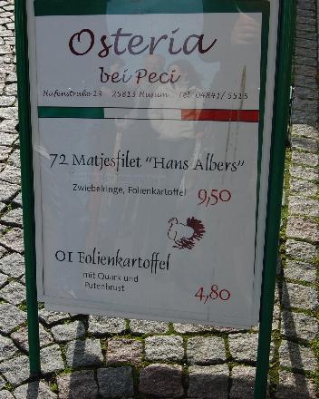 Tag zwei: Von der Eastcoast an die Westcoast, auf nach Husum. Zwischenhalt in Bohmstedt – wo nicht nur Peter Lustig wohnt, sondern auch Kevin einen Teil seiner Jugend verbracht hat. Vergangenheitsbewältigung und so. Danach Fischbrötchen in der Stadt und Wind in die Fresse aufm Deich. 72 Matjesfilets und die Oi-Kartoffel wären auch verlockend gewesen. Abends dann Italiener und Burn after Reading.