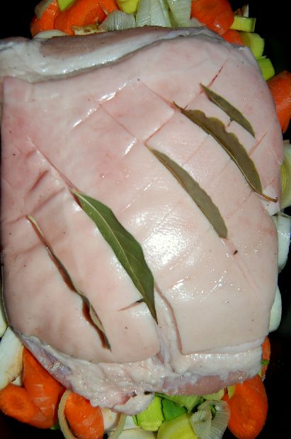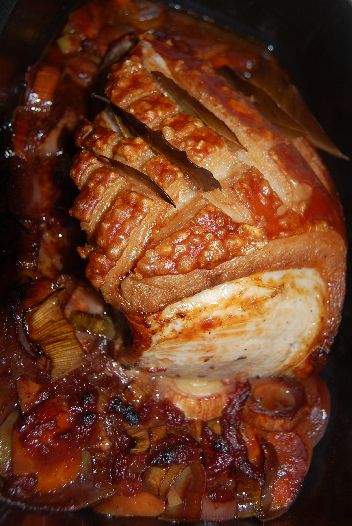 Zutaten: 1 Schinkenbraten ca. 2 kg schwer, 4-5 Lorbeerblätter, 1